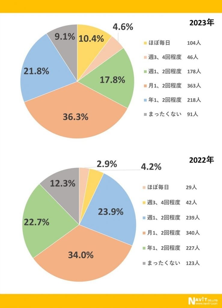 「年に1、2回程度」という方は昨年(22.7%)とほぼ変わらずの21.8%となっています。次に「ほぼ毎日」が昨年(2.9%)より7.5%増えて10.4%となっています。