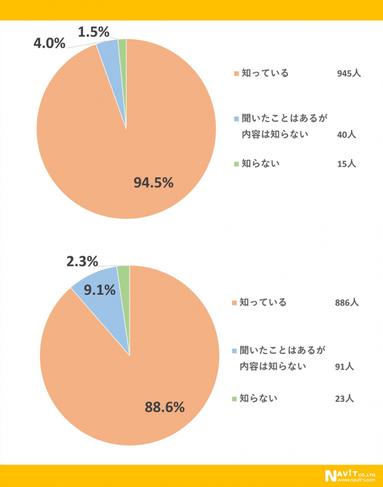 昨年(88.6%)と比べて5.9%も増えています。続いて「聞いたことはあるが内容は知らない」という方が4.0%で、昨年(9.1%)より5.1%減っています。この減った分が内容まで含めての認知に変化したのでしょう。