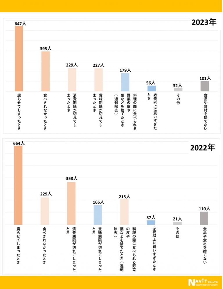 次に「食べきれなかったとき」が395人で、こちらは昨年の229人から166人も増えています。続いては「消費期限が切れてしまったとき」が229人で、こちらは逆に昨年の358人から129人減る結果となりました。