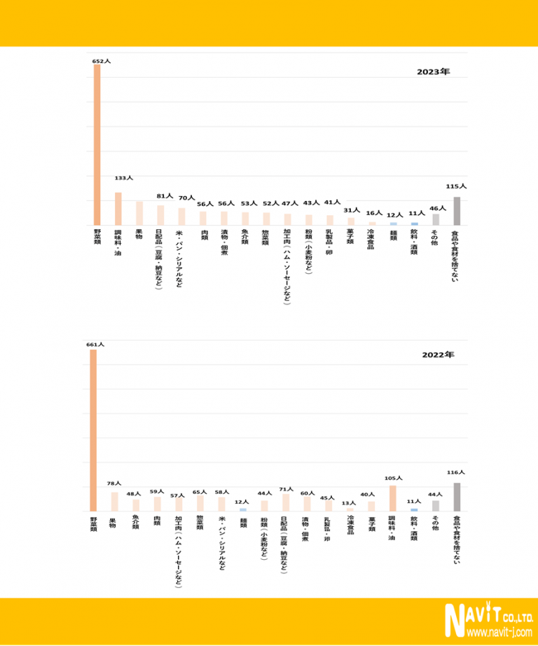 この質問に対してダントツで多いのが「野菜類」となっています。今年の調査では652人で昨年の661人からほぼ横ばいです。
