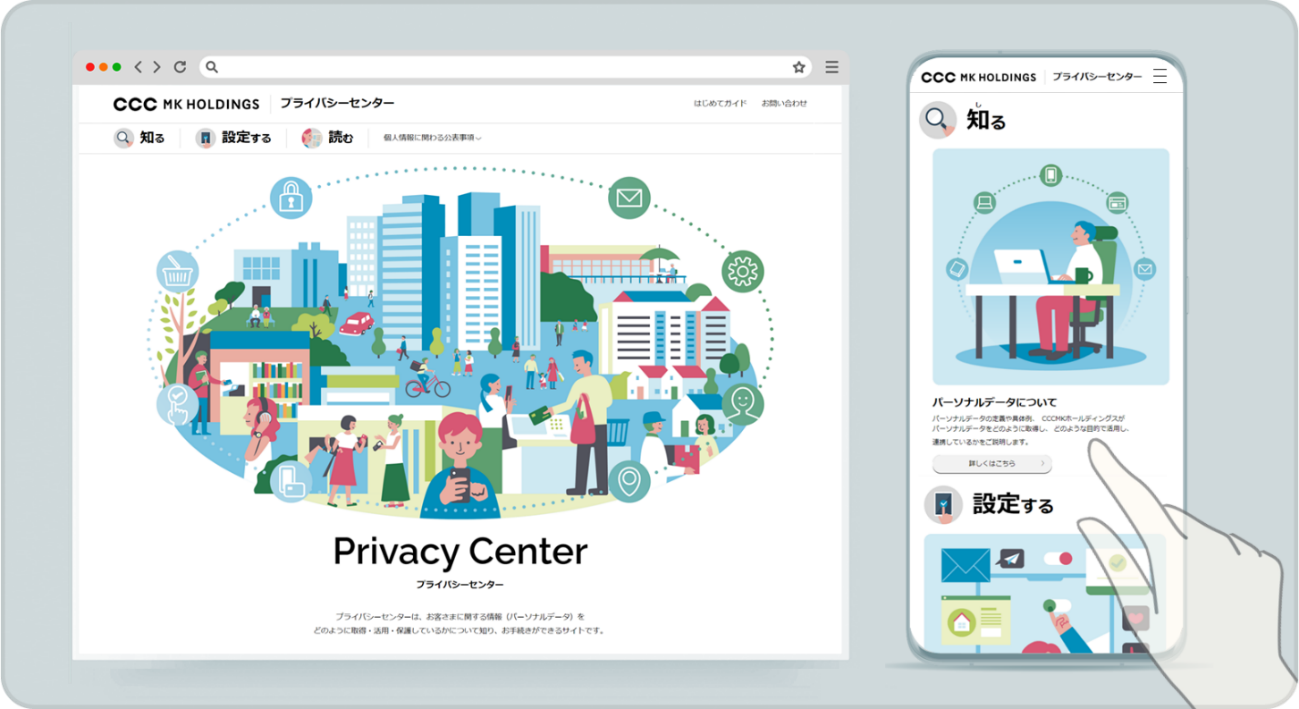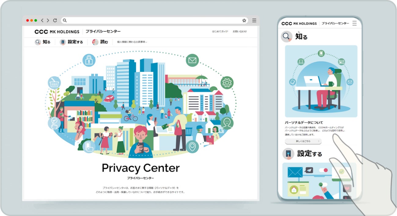 「プライバシーセンター」は、パーソナルデータの取り扱いについて、分かりやすく説明をすることで、透明性を高めていくことを目的としています。今後、CCCMKホールディングスにおけるパーソナルデータに関する取り組みについての情報発信は、「プライバシーセンター」上で行ってまいります。また、「プライバシーセンター」では、パーソナルデータを活用することの可否をお客さまが選択できるよう、パーソナルデータのお手続きが簡単にできるメニューをご用意いたしました。