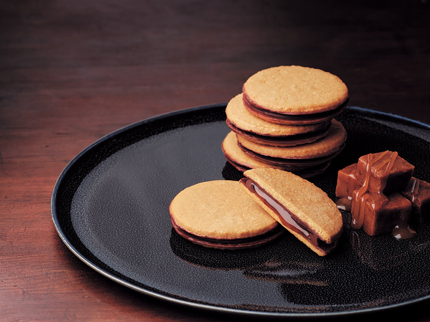 コク深い、とろりととろけるキャラメルをチョコレートで包み、さっくりと香ばしいクッキーでサンドしました。キャラメル、チョコレート、クッキーの絶妙なハーモニーをお楽しみください。