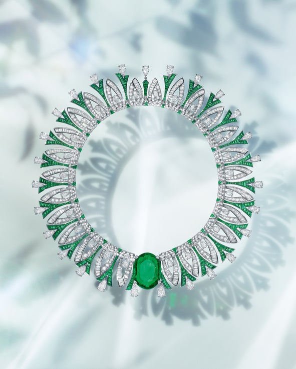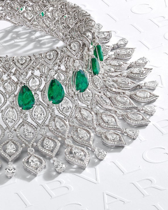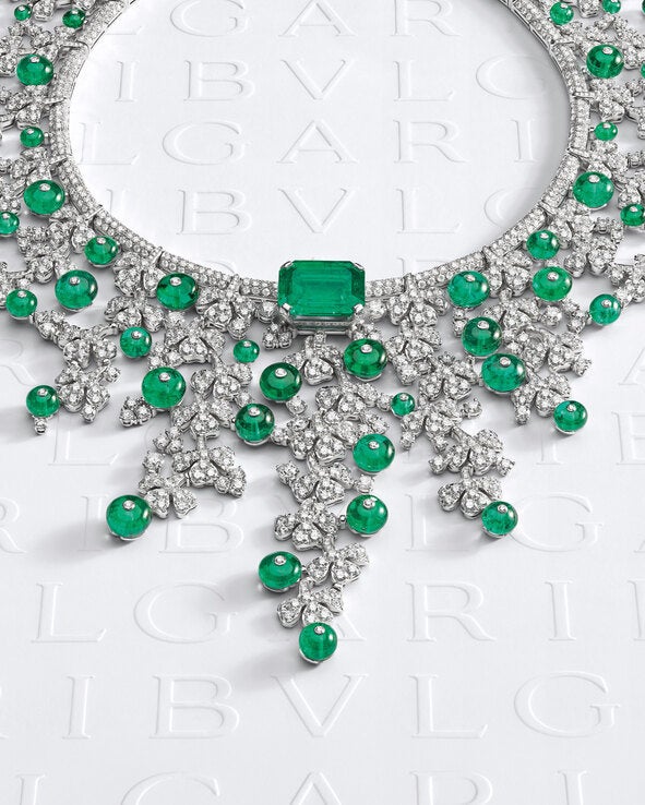 華やかなパリの夜のような輝きを放つこのピースは、手作業で2000時間もの製作時間を要し、35.53カラットという素晴らしいコロンビア産エメラルドが用いられています。オーバルシェイプのコロンビア産エメラルドをエメラルドとダイヤモンドの精緻なインレイが囲み、かのエッフェル塔の細長いシルエットを想起させます。動きと重さのバランスをとりながらブルガリの職人技術がそのハーモニーを奏でるネックレスを作り上げることに成功しました。宝石が持つ独自の貴重さはそのままに、しなやかで軽い見事なフィット感をかなえています。