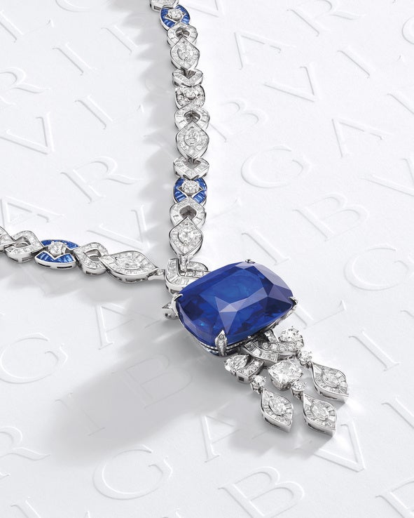 プラチナとダイヤモンドを用いたネックレス「セルペンティ オーシャン トレジャー」は、2匹の蛇が一つになり、ドロップシェイプの至極のスリランカ産サファイア(61.30カラット)に続いています。