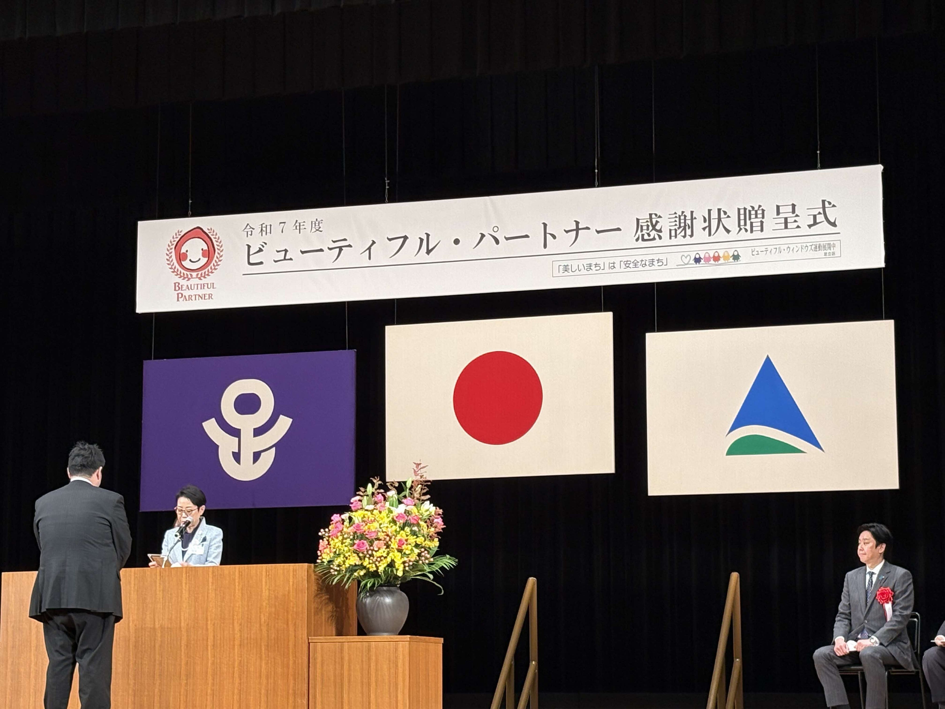 贈呈式は、西新井文化ホール(足立区栗原)で開催され、パルシステム東京足立センターの坂本裕俊センター長が出席しました。ビューティフル・パートナー感謝状は、足立区が「ビューティフル・ウィンドウズ運動」として犯罪のない安全・安心なまちづくりをともに推進する団体や人に贈呈されます。パートナーとの協同による防犯活動や街の美化、交通安全などの活動を推進しており、足立センターは、廃棄物減量や再利用の目標を設定し、適正処理を積極的に推進する事業活動が評価されました。