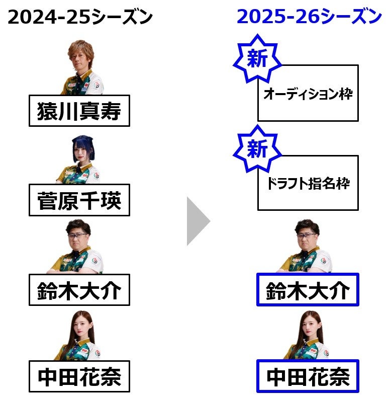 来シーズンのチーム編成は、鈴木大介選手+中田花奈選手+ドラフト指名選手、そして残る1枠の選手は「BEAST X メンバー入替オーディション」(以下「オーディション」)にて決定いたします。