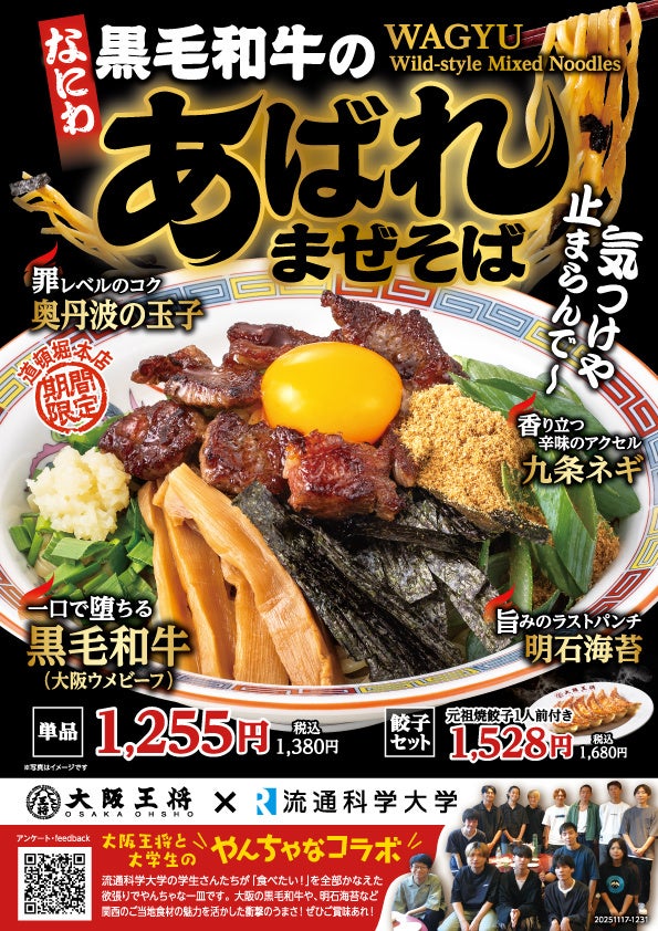 イートアンドグループで餃子専門店「大阪王将」を運営する株式会社大阪王将(東京ヘッドオフィス:東京都品川区 代表取締役社長:文野幸司)は、流通科学大学(神戸市西区/学長:清水信年)と連携をした社会共創プロジェクトとして、新メニュー『なにわ黒毛和牛のあばれまぜそば』を11月17日(月)より大阪王将 道頓堀本店にて限定販売いたします。