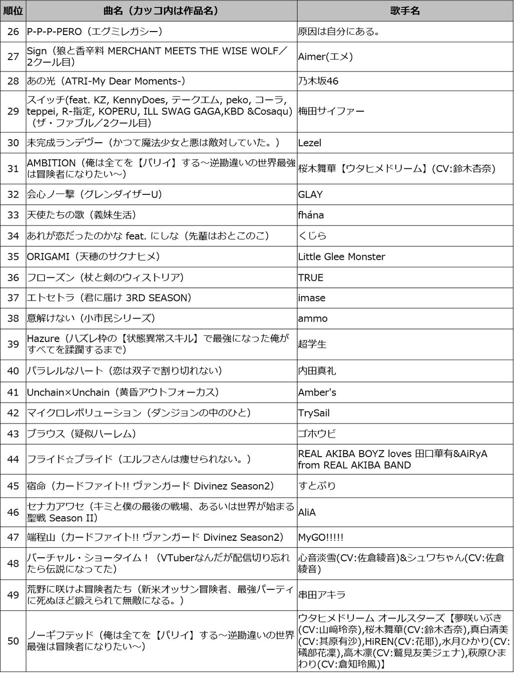 ■通信カラオケDAM 2024年夏アニメ主題歌 カラオケランキング TOP50(26位~50位)