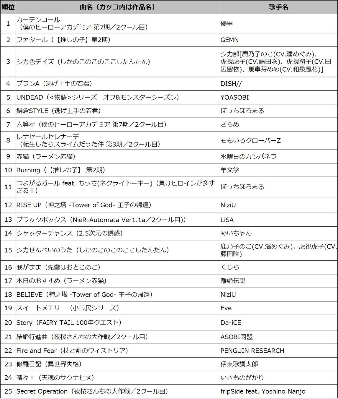 ■通信カラオケDAM 2024年夏アニメ主題歌 カラオケランキング TOP50(1位~25位)