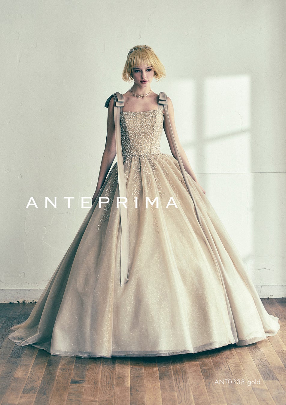 業界で注目のリボンテクニックを駆使した、シンプルで上品なアンテプリマらしいドレスが登場。繊細なインポートビジューレースに軽やかなラメチュールを重ね、洗練された仕上がりに。リボンショルダーは肩から外せる2WAY仕立てで、プレーンなビスチェトップとしても着用可能。手作業で丁寧に仕上げられたウエストビジューやアクセサリーも必見です。