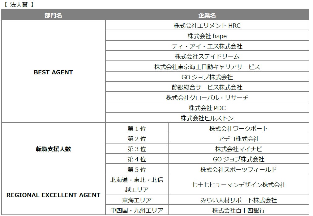 BEST AGENT:転職支援数が優れており、転職希望者から高い満足度を得ている転職エージェントを選出