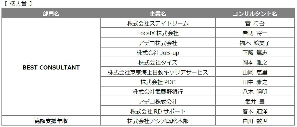 BEST CONSULTANT:転職支援数が多く、転職希望者から高い満足度を得ているコンサルタントを選出