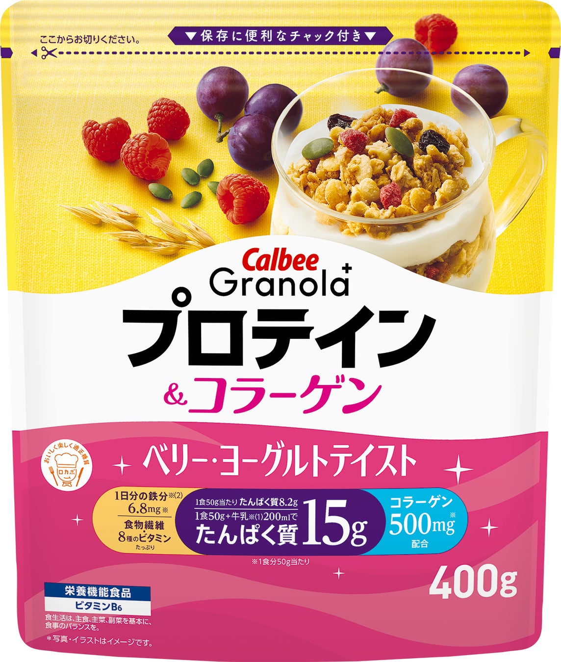 ●『Granola+ プロテイン&コラーゲン』はベリー・ヨーグルトテイストのグラノーラです。ラズベリーやレーズン、かぼちゃの種をトッピング。1食分(50g)+牛乳(※3)200mlでたんぱく質15gとコラーゲン500mg(※4)を含有しています。