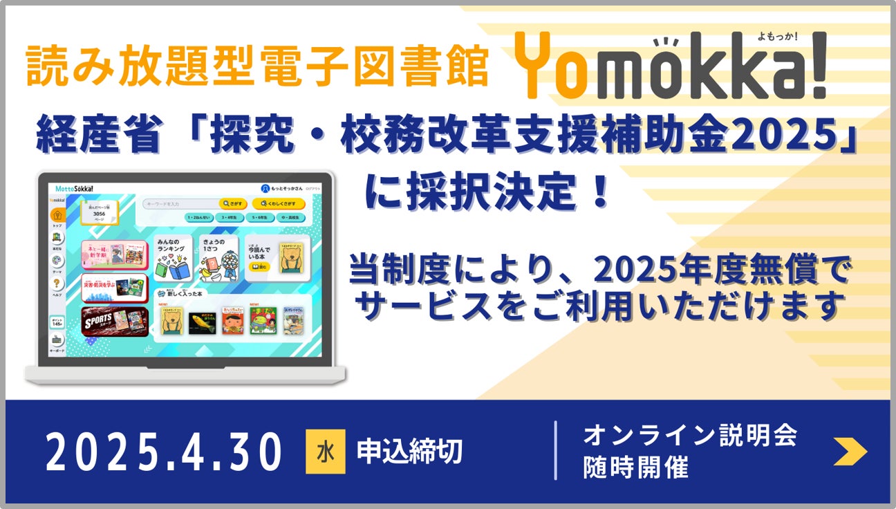 読み放題型電子図書館「Yomokka!(よもっか!)」が経産省「探究・校務改革支援補助金2025」に採択決定!無償導入を希望する自治体の募集開始【4月30日(水)締切】