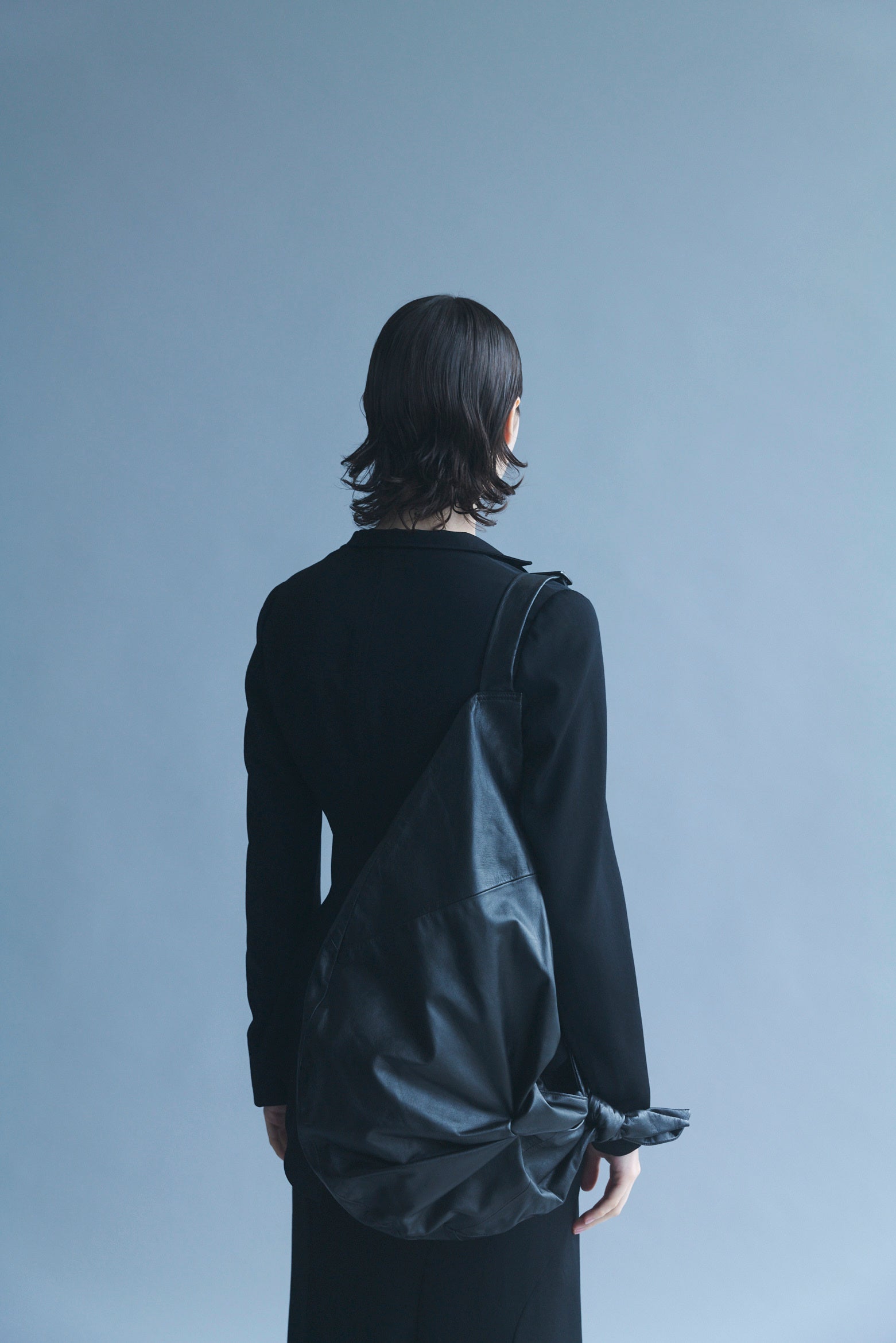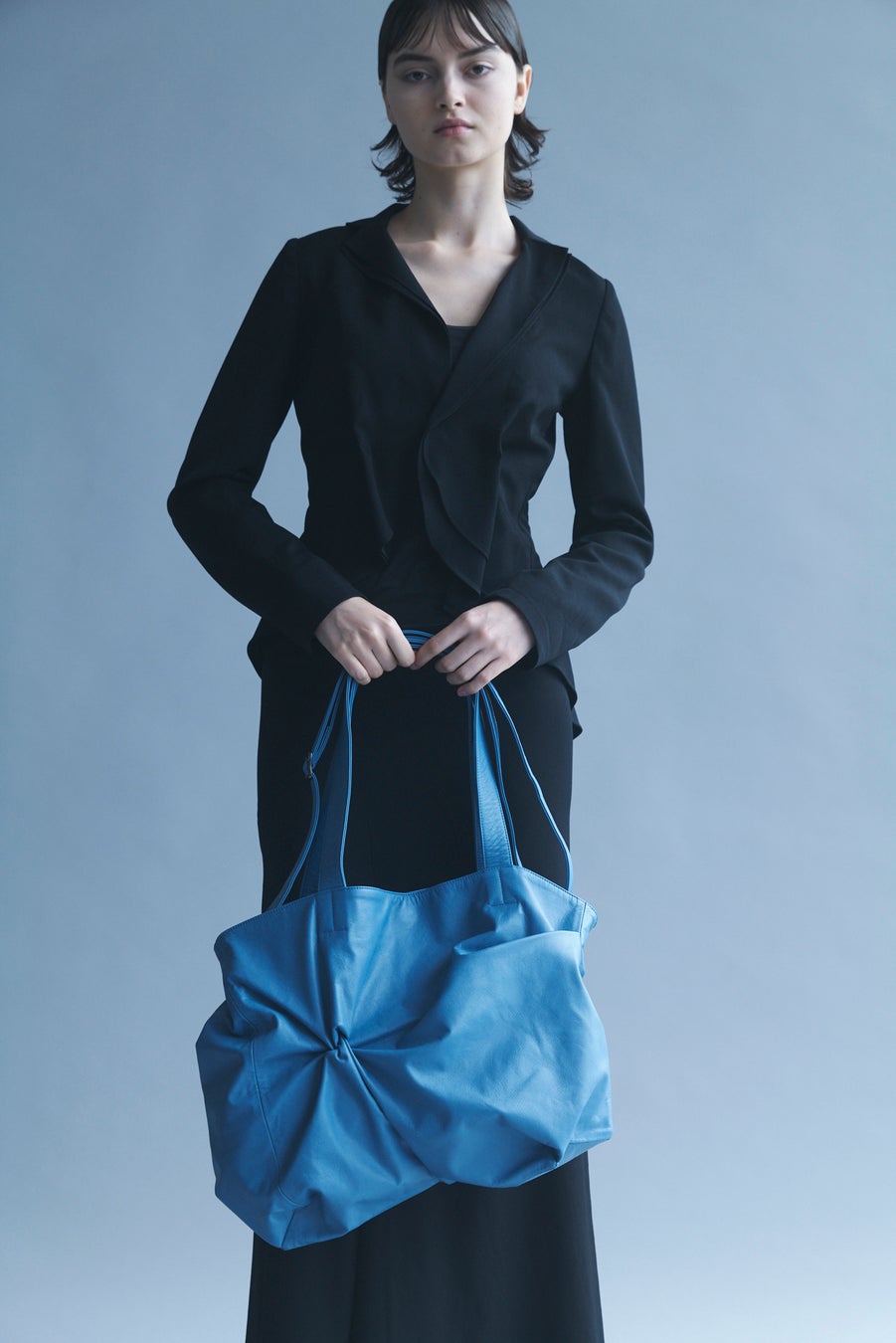 前面にひとつ、つまんだようなタックを入れることで、平面に変化を与えた「PLUCK」バッグ。その立体感は、花のように静かにその存在感を誇示する。いずれも柔らかくしなやかなガーメントレザーで作られており、A4サイズも収納可能で実用的。見た目にボリュームはありながらも、そのデザインは日常に溶け込むよう計算されている。