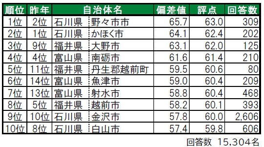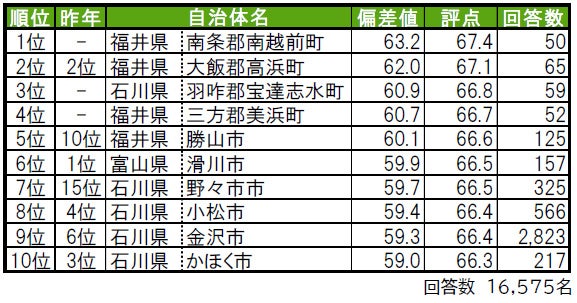 ●トップ2は、石川県の自治体がランクインする結果となっています。また、トップ10のうち、石川県から4自治体、福井県と富山県はそれぞれ3自治体と、北陸3県の街が万遍なくランクインする結果となっています。