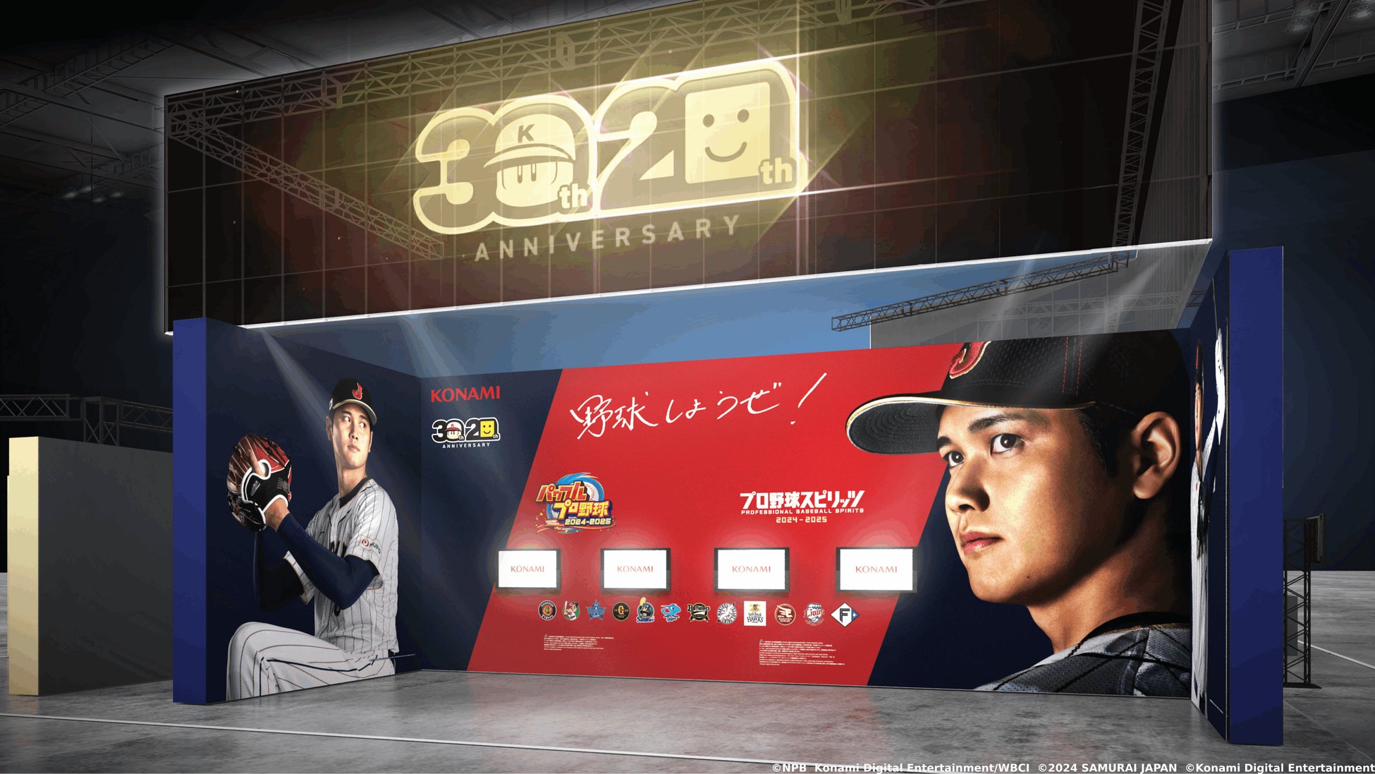 KONAMI野球ゲームアンバサダーの大谷翔平選手のデザインが施された高さ4m超えの壁面装飾を展示するほか、10月17日(木)に発売予定のシリーズ20周年記念作品『プロ野球スピリッツ2024-2025』の試遊ができます。さらに、当日お越しいただいた方に先着で、大谷翔平選手とパワプロくん、調子くんが描かれた周年限定ステッカー※2を配布予定です。