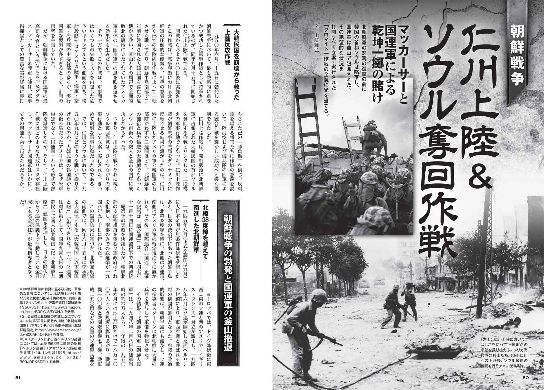 第二特集「[朝鮮戦争]仁川上陸&ソウル奪回作戦」では、朝鮮戦争開戦後に一気に南下した北朝鮮軍に押されまくって釜山周辺に追い込まれた韓国軍と米軍主体の国連軍の窮状を打開するために実施された「クロマイト」作戦の全貌に迫ります。本作戦は米軍首脳部の反対にもかかわらずマッカーサーが強く主張し実施した作戦で、最前線のはるか後方、北朝鮮軍に占領された韓国の首都ソウルを奪回し北朝鮮軍の兵站線を遮断、釜山に包囲された部隊も併せて攻勢に出ることで戦局を一気に覆すことを狙ったものでした。記事ではその背景から作戦の顛末、そしてその意義について見ていきます。