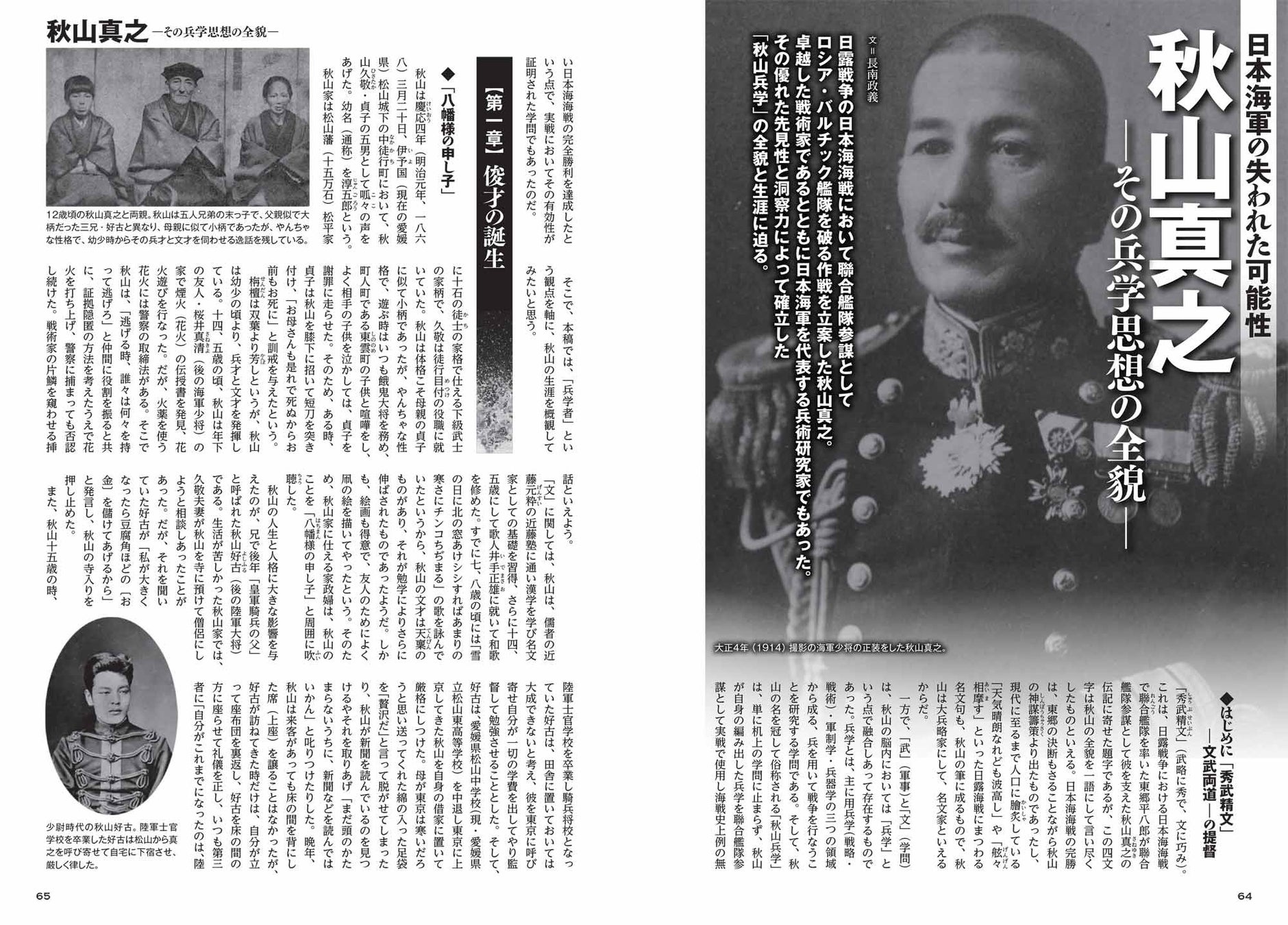 第三特集「日本海軍の失われた可能性 秋山真之~その兵学思想の全貌」では、日露戦争当時の連合艦隊参謀としてロシア艦隊撃滅の作戦を立案、これを成功に導いた秋山真之の生涯とその兵学思想の内実について論じます。特に、その洞察力と先見性から将来の戦いを的確に予測していたと指摘している部分については、ぜひお読みいただきたい部分です。