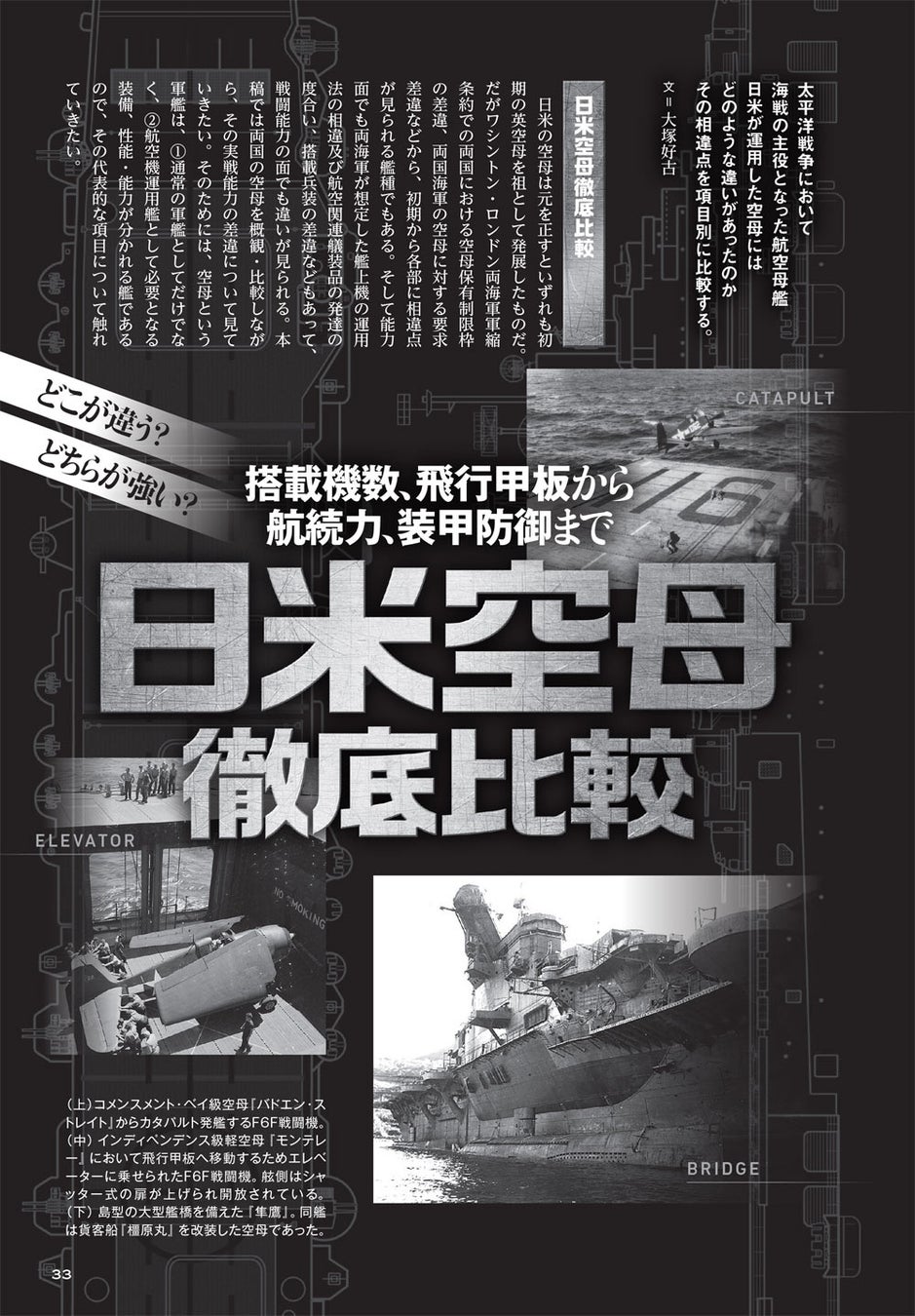 第一特集の「日米空母徹底比較」では、太平洋戦争で戦艦に代わって海戦の主役となった日米海軍の航空母艦を、種類(大型空母、小型空母、商船改装空母等)ごとに徹底比較します。空母という軍艦は、(1) 船としての部分と、(2)艦上機を運用するのに必要な部分に大別できます。本記事もその視点から2部構成とし、そのうえで船体構造、航続力、艦上機の搭載数、飛行甲板形状など、さまざまな項目で比較し、両者の長短所を浮き彫りにするとともに、どちらがどう優れていたのかを考察します。
