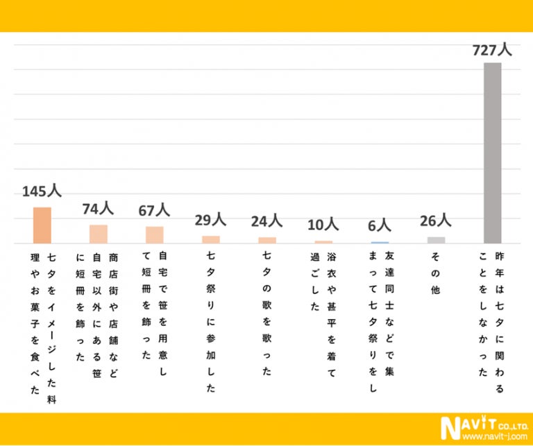 複数回答で回答していただいた項目ですが「七夕をイメージした料理やお菓子を食べた」という方が145名で「商店街や店舗など自宅以外にある笹に短冊を飾った」という方が74名いらっしゃいます。また「七夕祭りに参加した」という方が29名いらっしゃいます。