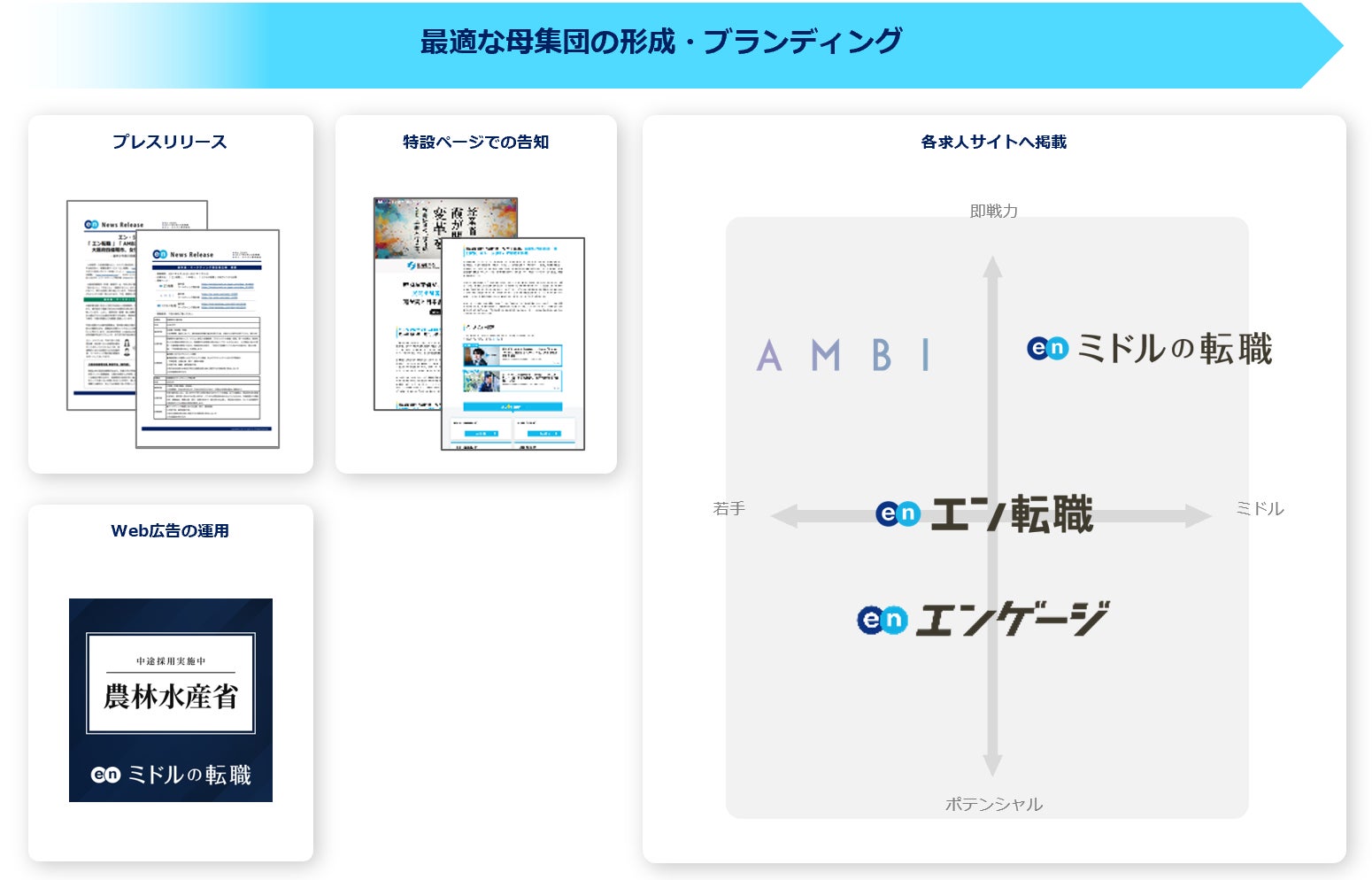 プレスリリースや特設ページ、Web広告での告知に加え、各求人サイトでの集客支援を実施。『エン転職』『エンゲージ』『AMBI』『ミドルの転職』とターゲットの異なる求人サイトを活用することで、ターゲットへ網羅的に求人を届けます。