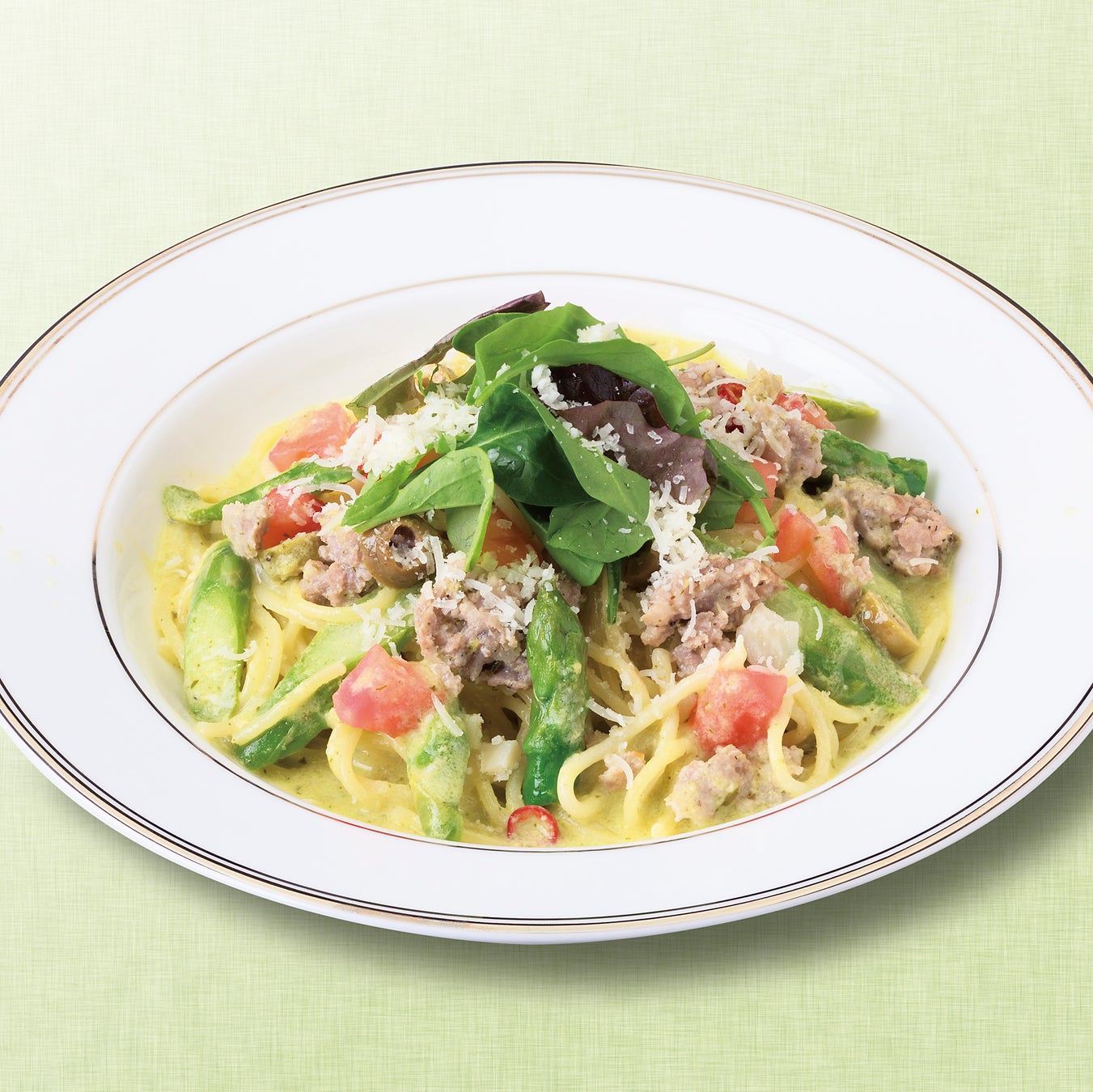 - パセリバター香る春菜と粗挽きポークのパスタ