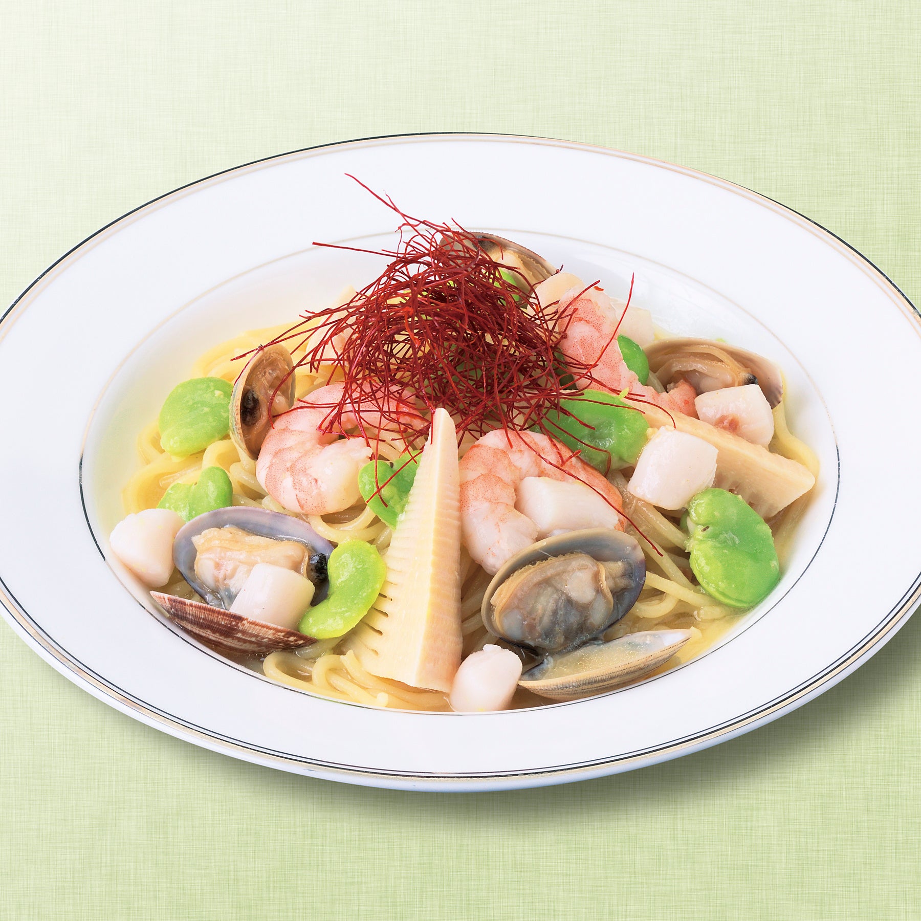 魚介の旨味を凝縮した自家製ボンゴレソースに、エビ・小柱・あさりの魚介でさらに旨味をプラス。空豆、タケノコの豊かな風味がアクセントに。
