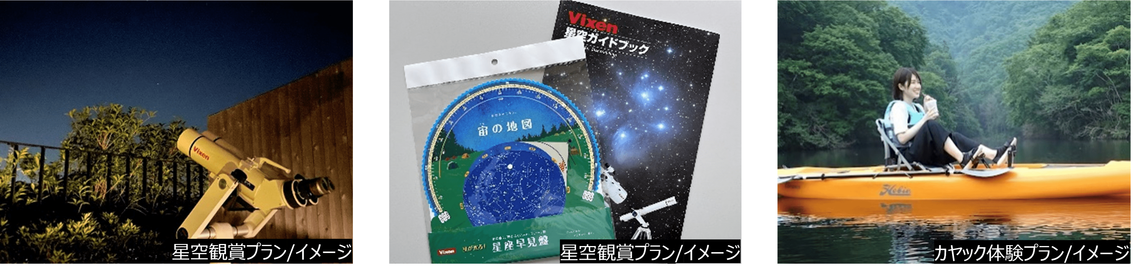 「星空観賞プラン」は客室にVixenの高性能天体双眼鏡を設置し、星座早見盤と星空ガイドブックをプレゼントいたします。また、雨の日でもお楽しみいただけるよう客室には星空プロジェクターもご用意しております。天体好きの方はもちろん、お子様にもお楽しみいただけます。また、期間限定で星をモチーフにした虎屋ういろの「ういろ」1本をプレゼントいたします。「カヤック体験プラン」は、VISON(ヴィソン)内の美しい池で、座りながら足で漕ぐ、初心者でも乗りやすいカヤックで心地よい風に包まれながら、雄大な自然を感じていただけます。価格は「星空観賞プラン」が34,500円~、「カヤック体験プラン」が31,400円~(いずれも1室1泊、2名1室利用/朝食付/税サ込)