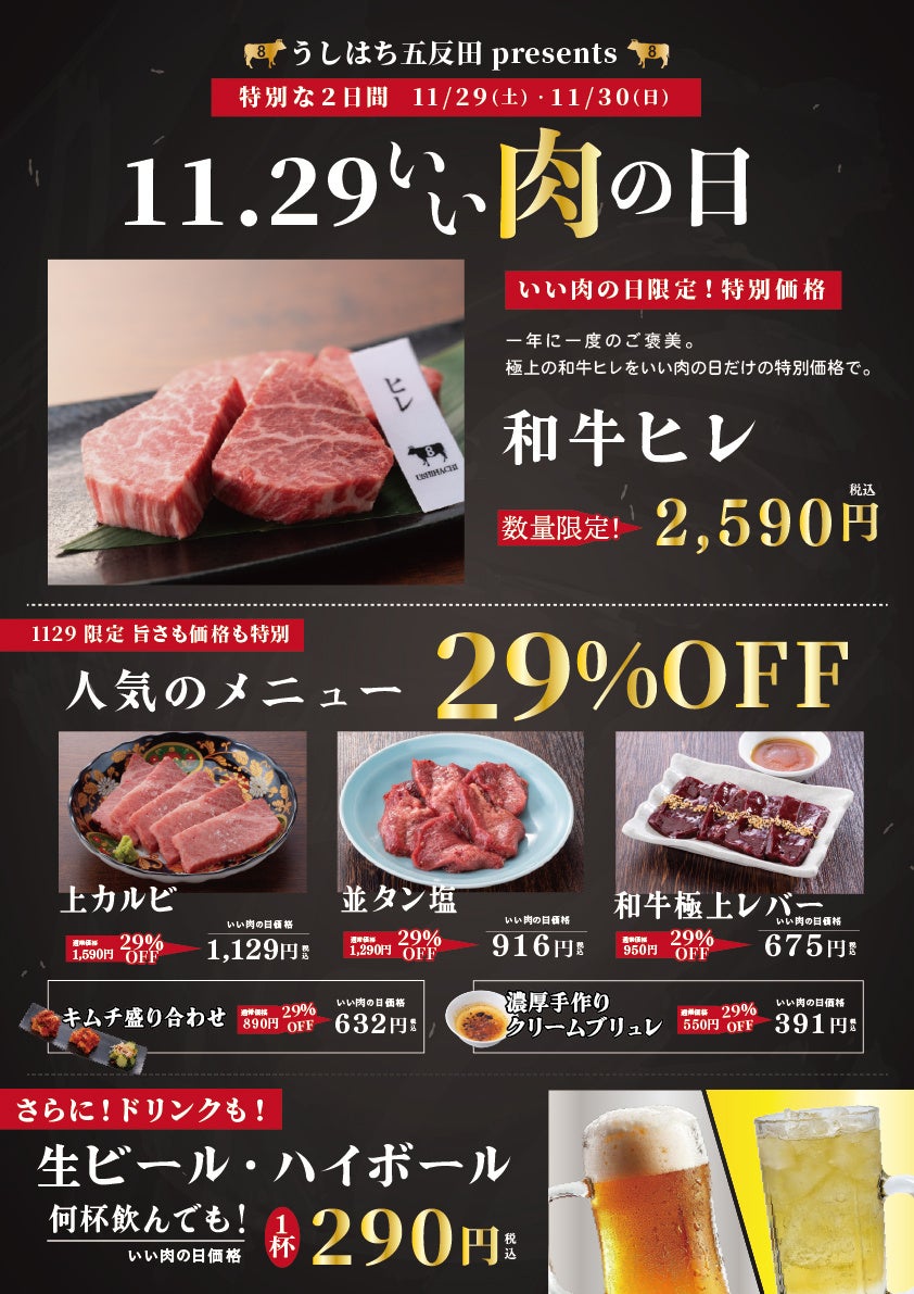 11月29日の"いい肉の日"にちなみ、「和牛ヒレ」が特別価格に、人気メニュー「上カルビ」や「タン塩」を含む厳選5品を29%OFFでご提供。さらに、生ビールとハイボールが何杯飲んでも1杯290円(税込)と破格のお値段でお楽しみいただけます。
