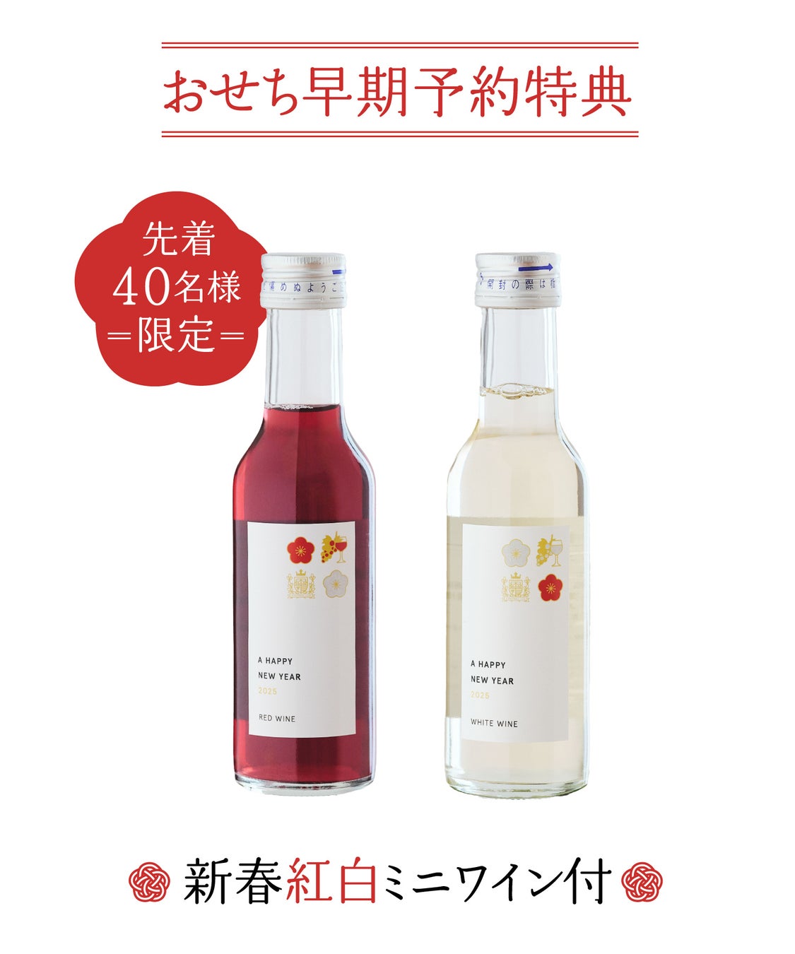 早期予約特典として、ジュングループのワイナリー「シャトージュン」で造られた、山梨県産のぶどうを100%使用した「新春紅白ミニワイン(各180ml)」を、ご予約いただいた先着40名様にプレゼントいたします。