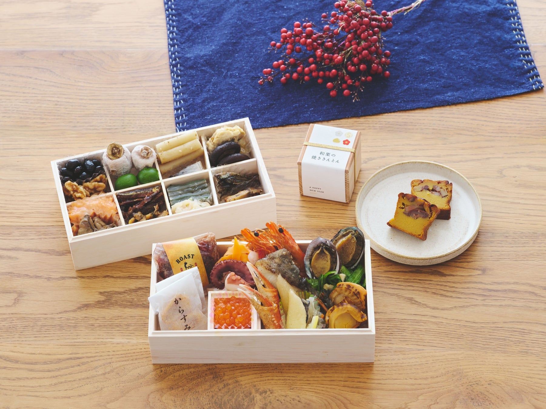 黒豆煮、くるみ甘露煮、市田柿、若桃甘露煮、たたきごぼう、にしん昆布〆レモン、湯葉の有馬煮、椎茸旨煮、サーモン塩麹、牡蠣のしぐれ煮、わかさぎ枕崎節和え、若炊あさり鰹節和え、重ね鯛昆布〆、つぶ貝酒盗和え、田作り煮、鮎山椒煮
