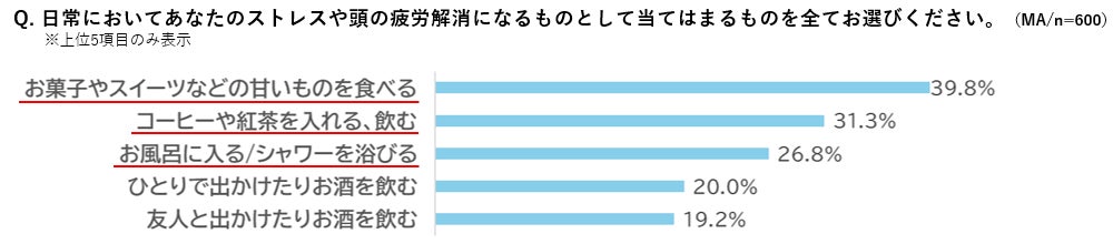 忙しい日々の中でも、ストレスや頭の疲労感に対して自分なりの解消法を実施している人も多数存在していました。コーヒーや紅茶を飲む、お菓子やスイーツなどの甘いものを食べるといったその場ですぐ取り入れられる行動だけでなく、お風呂に入る/シャワーを浴びるという既に多くの人の習慣になっている行動において、疲労感解消と、翌日のパフォーマンス向上への期待も担わせていることが分かりました。