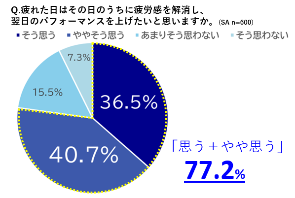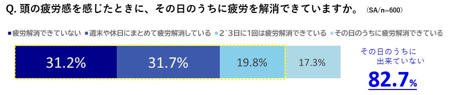 しかし、82.7%の方がその日のうちに疲労感を解消できていなく、31.7%の方がせっかくの週末や休日を疲労解消に当てている現実も見えてきました。既に存在している平日の習慣や時間の中で“頭の疲労解消”ができれば、負担なく翌日のパフォーマンス向上が期待できそうです。
