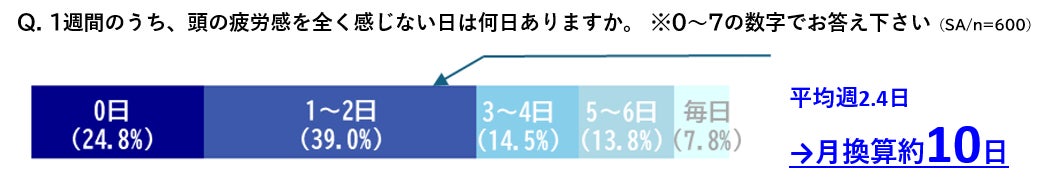 20代から30代の社会人のうち「頭疲れ」を抱えている人は約7割にのぼり、その方々は平均週に2.4日、つまりは月に10日間ほどしか頭の疲れを取れていないことが明らかとなりました。週休2日の企業に勤める社会人とした場合、頭の疲労感を感じていないのは休みの日のみであることが推測でき、平日はほぼ毎日、頭の疲労感を感じていることになります。