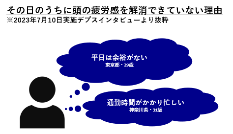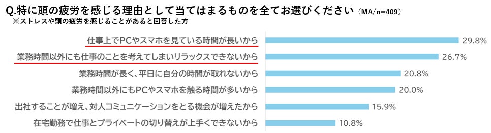 「仕事上でPCやスマホを見ている時間が長いから(29.8%)」、「業務時間以外にも仕事のことを考えてしまいリラックスできないから(26.7%)」が上位にのぼり、業務時間の長さや仕事内容が要因であることが伺えます。疲労を感じる理由が仕事と切り離せない内容故に、仕事をしている平日はほぼまるごと頭の疲労を抱え続けてしまうのも、納得です。