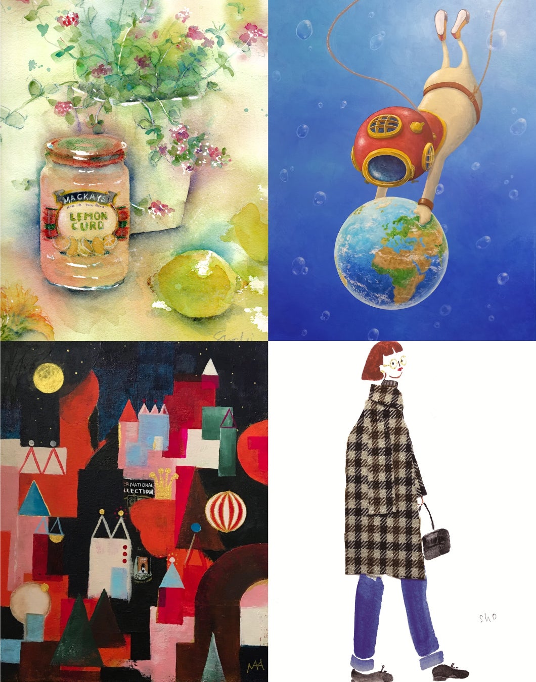 右下:Shoko Miyagawa 「チェックコートの女の子」 7,700円<アクリル画 13.3cm×18.5cm>