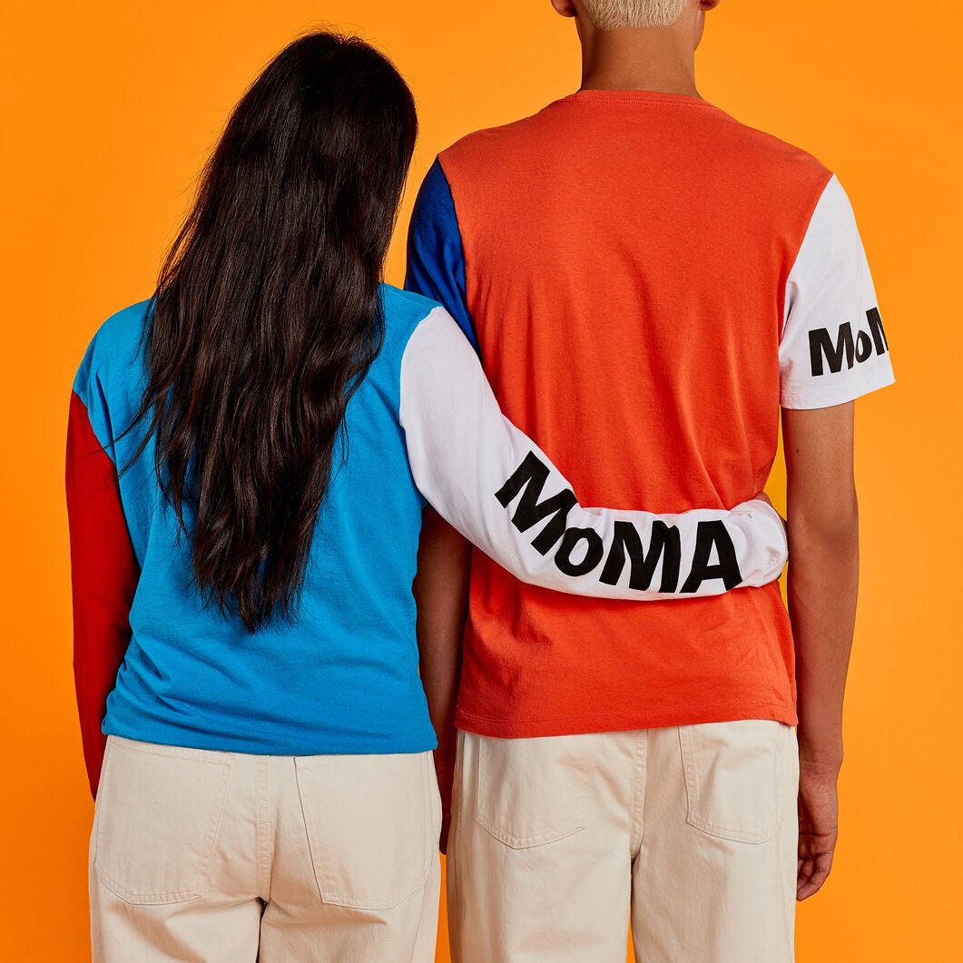 2019年のニューヨーク近代美術館リニューアルオープンを記念して新たにデザインされたMoMAロゴシリーズのTシャツ。鮮やかなカラーブロッキングプリントとMoMAのロゴが特徴です。