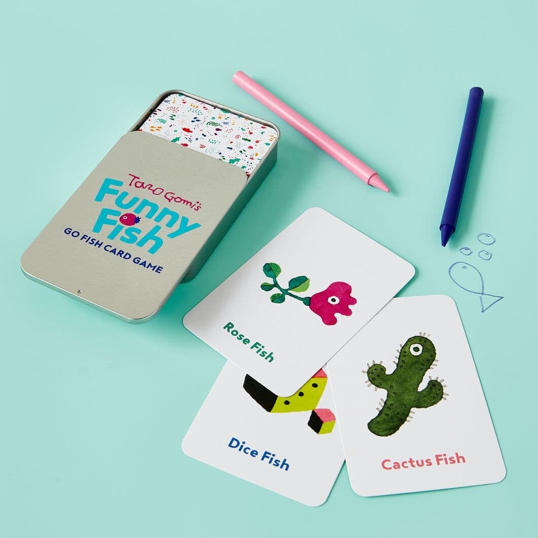 日本の絵本作家、五味太郎のイラストが描かれたGo Fishゲーム用カードセット。Go Fishは相手に欲しいカードを要求してカードをもらい、同じ数字のカードを4枚集めてセットを作るゲームです。Rose FishやCactus Fishなど愉快な海底生物がゲームを一層楽しくします。Go Fishゲーム以外にも神経衰弱でも遊べます。