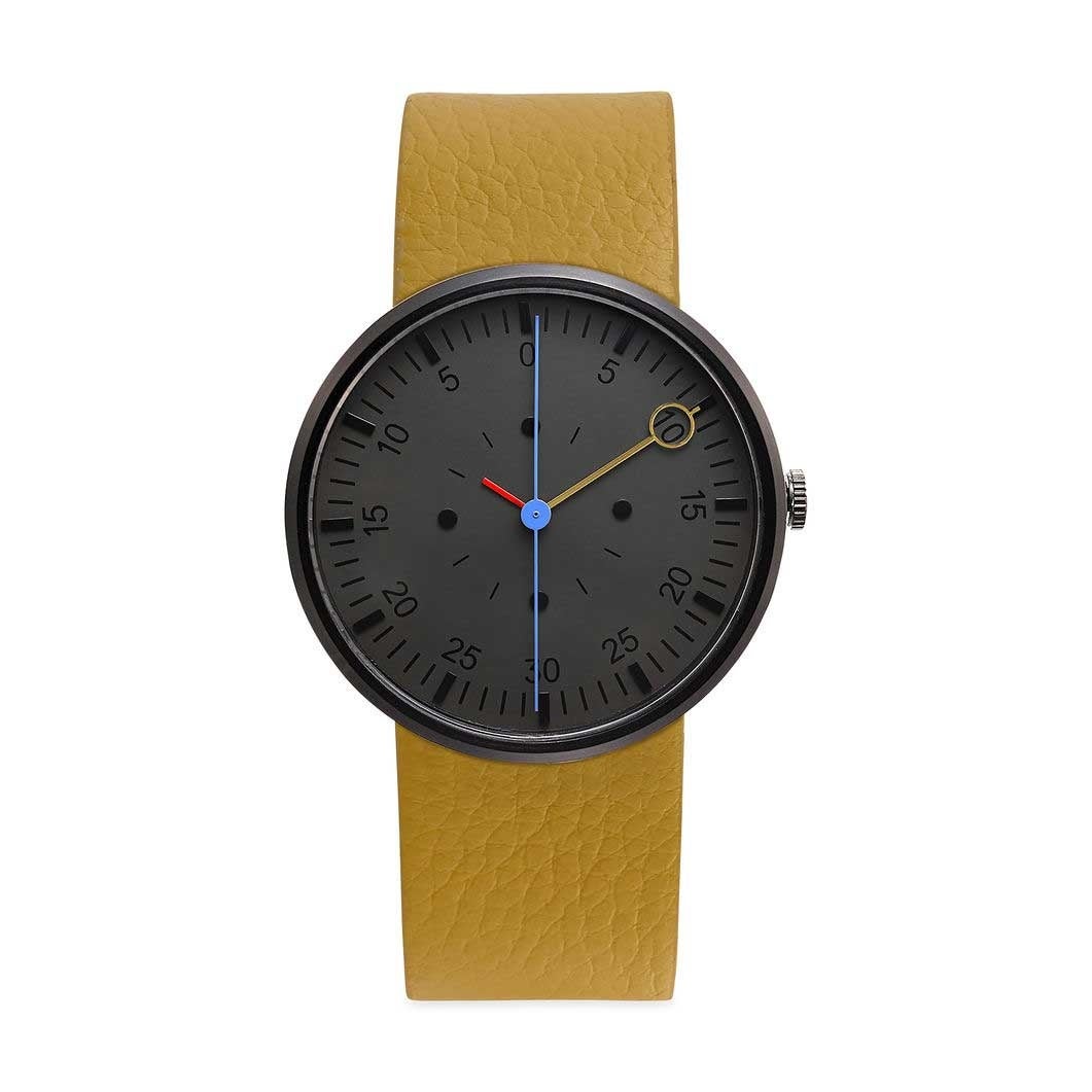 ルーマニアの時計製造技術を称える腕時計です。この時計のシリーズ名である「Fărăzece」とはルーマニア語で「10分前」を意味します。ルーマニア人の時間の読み方が由来で、この独特な時計を読む鍵にもなっています。文字盤上の12時の位置に0が置かれ、5分ずつ増えながら30分まで時間を刻み、そこからは逆に減少していきます。アンバランスな時針、分針、秒針は、1980年代初頭のメンフィスグループの遊び心に満ちたポストモダニズムを反映しています。