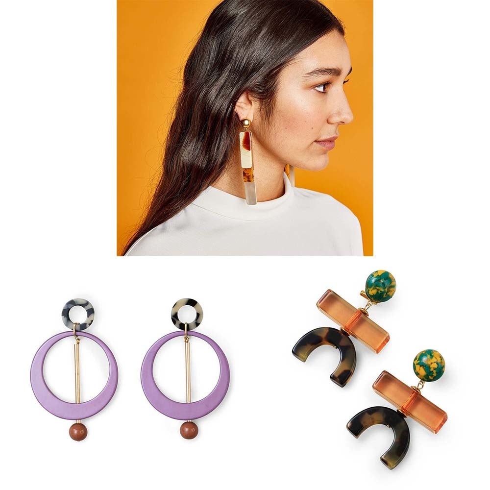 ファッションデザイナーのレイチェル・コーミーは、デビッド・ボウイのために作られた手描きのTシャツからキャリアをスタートさせ、イタリア製のアクリルジュエリーで有名になりました。ハンドメイドで制作された大きめのデザインピアスは、コーディネートのアクセントになります。