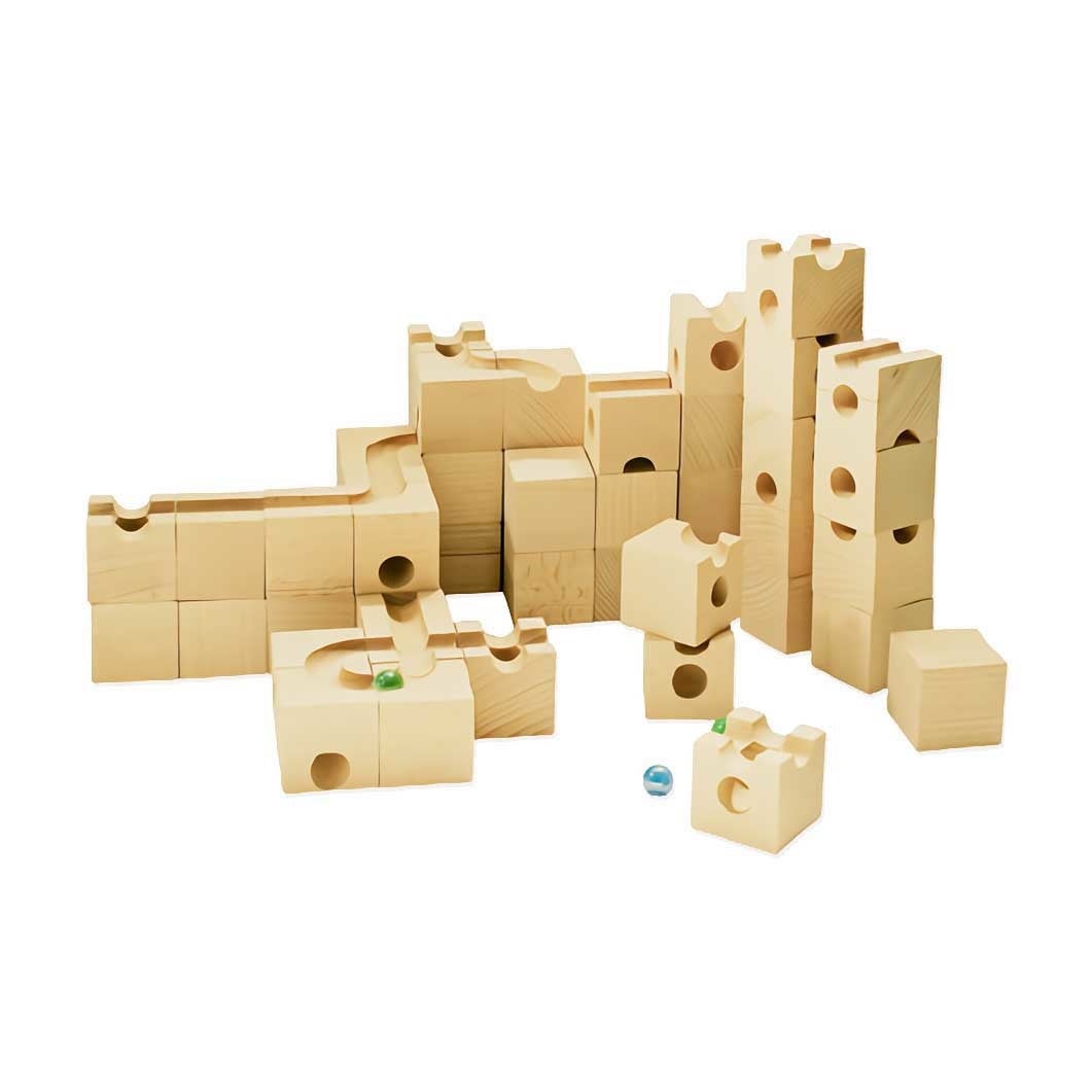 cuboro(キュボロ)は溝のついた5cm角の立方体を組み合わせ、上から落とした玉が下まで通る道を工夫して作る遊び。外からは見えない内側にも玉の道ができるので遊びの中で三次元の構成力や集中力が自然と培われていきます。スタンダードセットには初歩的な遊びから複雑で長い道をつくるのに必要な12種の全てのパーツが含まれています。このセットでキュボロの遊びの醍醐味は充分に味わうことができます。