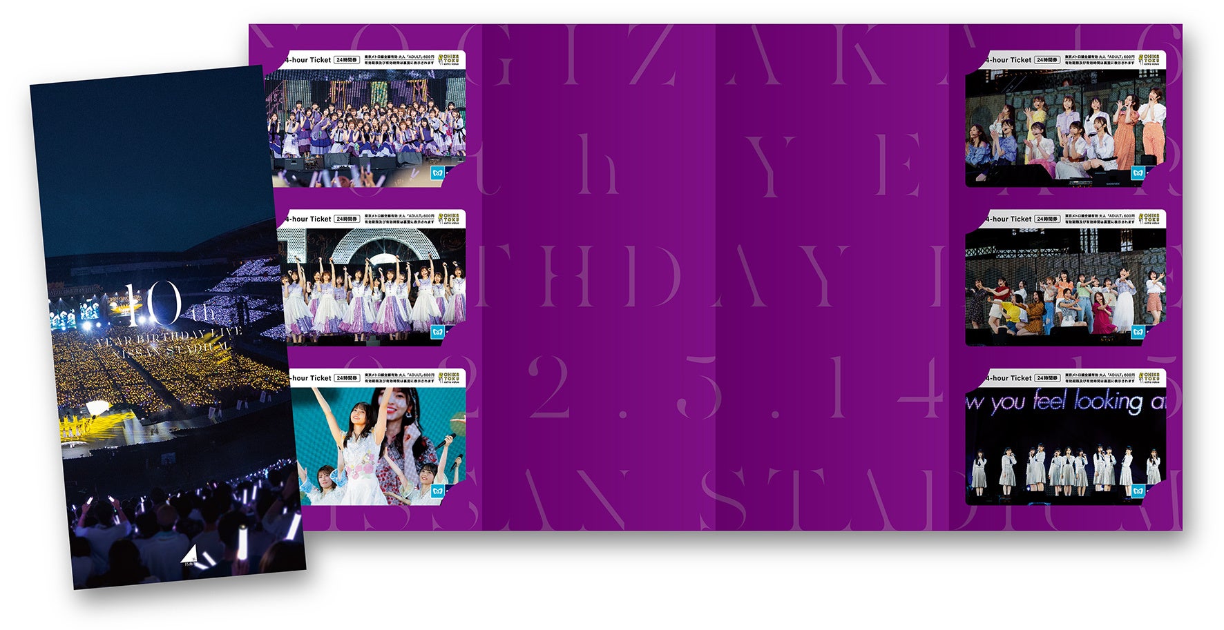 今回の東京メトロオリジナル24時間券は、2022年5月に日産スタジアムで開催され2日間で14万人を動員した「乃木坂46デビュー10周年記念ライブ」時の貴重なお宝写真をデザインした券面とし、大人用6種類(6枚)を1セットとして専用台紙付きで発売します。