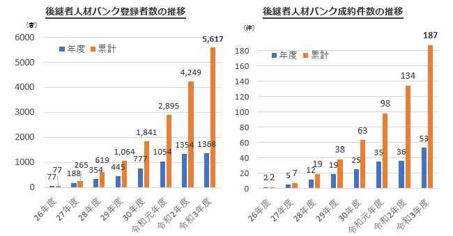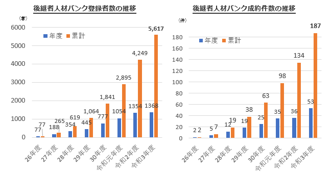また、創業希望者と後継者がいない中小企業の事業引継ぎの橋渡しを行う後継者人材バンク事業の、登録者数が1,368者(前年度比101%)、うち成約まで至ったものが53件(前年度比147%)といずれも過去最高となりました。また、累計登録者数が5,000者を超え5,617者となりました。うち累計成約件数は187件となっています(資料3参照)。