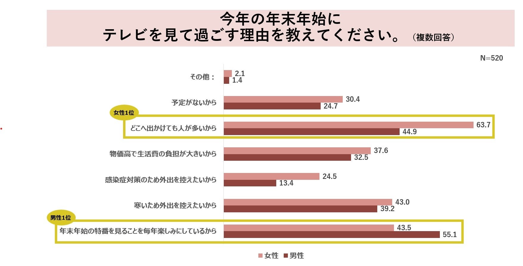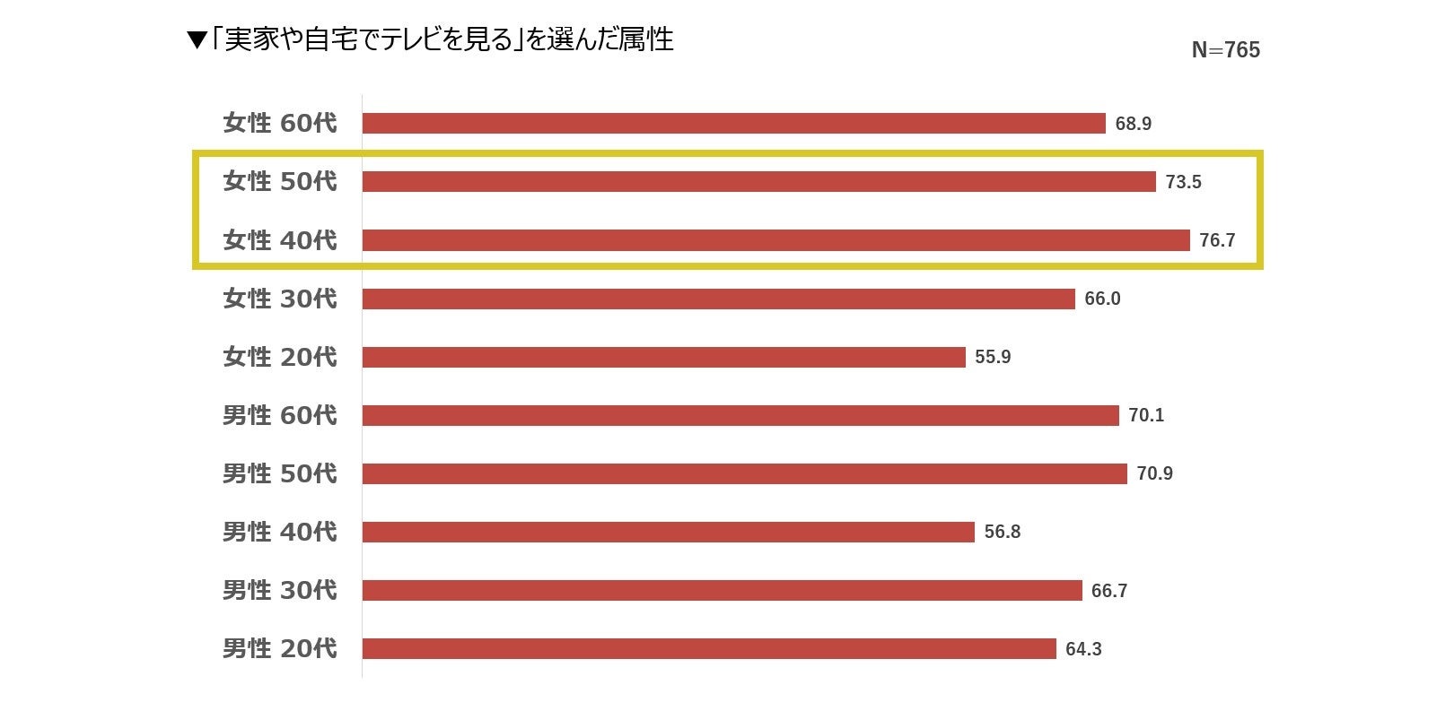 今年の年末年始にテレビを見て過ごす理由を聞いたところ、男性の1位は「年末年始の特番を見ることを毎年楽しみにしているから」という回答で55.1%に及びました。一方、女性の1位は「どこへ出かけても人が多いから」を選んだ人が63.7%となり、年末年始にテレビを見て過ごす理由は男女で異なることがわかります。異なる理由として推測されるものは、「年末年始の特番を楽しみにしている」と回答した男性は、どの世代も50%以上で半数の人が回答している結果に対し、女性の20~30代は50%超えているものの、40代以上は30~40%という結果となりました。この結果から、母親世代は年末年始に家族で過ごすための準備をしていることで、リアルタイムに特番を視聴することが難しい状況にあることが予想されます。