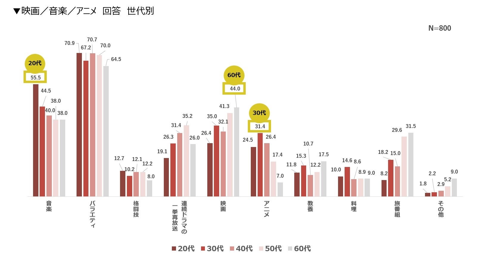「映画」。「音楽番組」は20代、「アニメ」は30代、「映画」は60代が多い傾向》