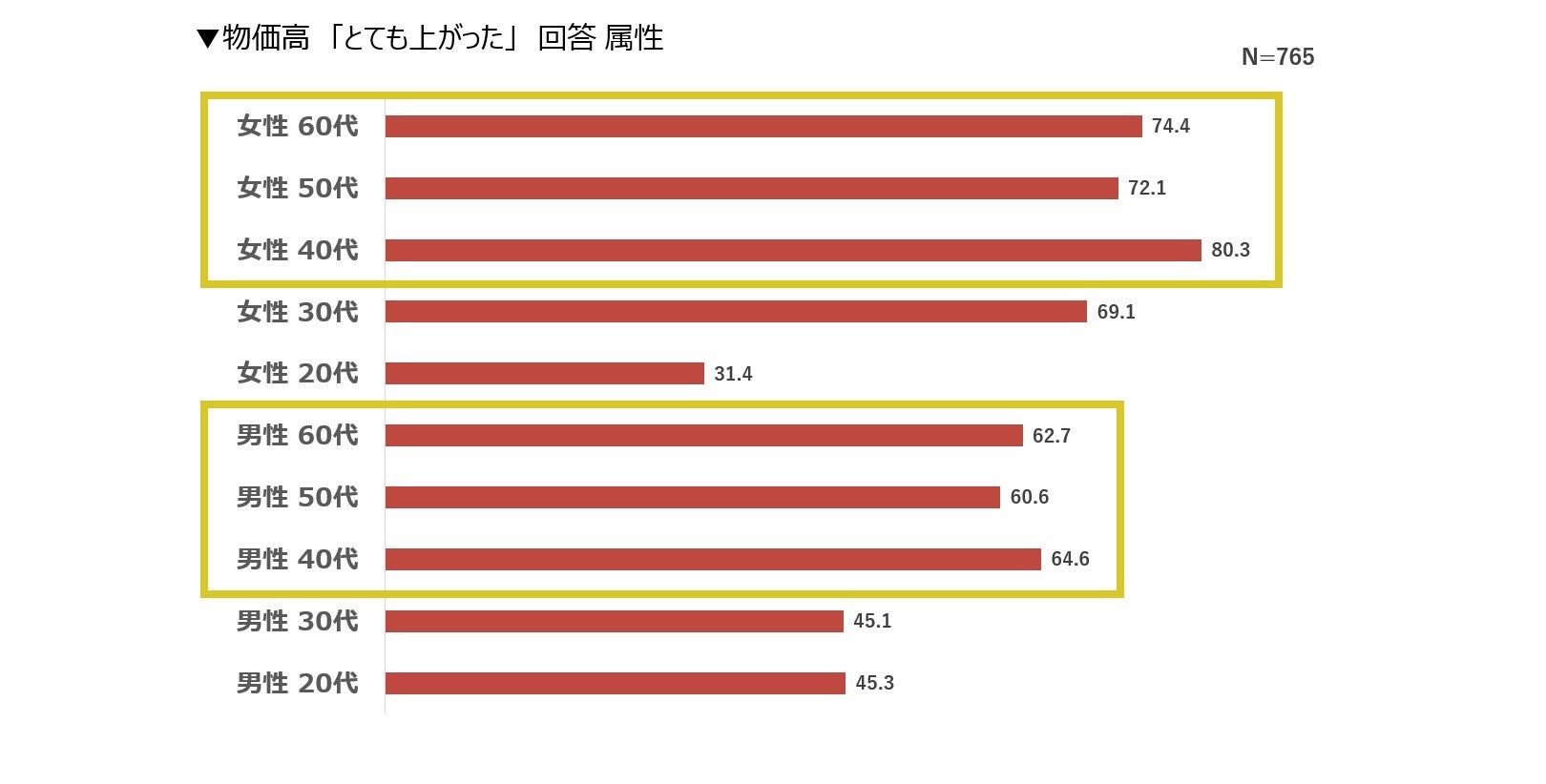 ■昨年に比べ現在の物価が「とても上がった」と感じる人は6割以上、