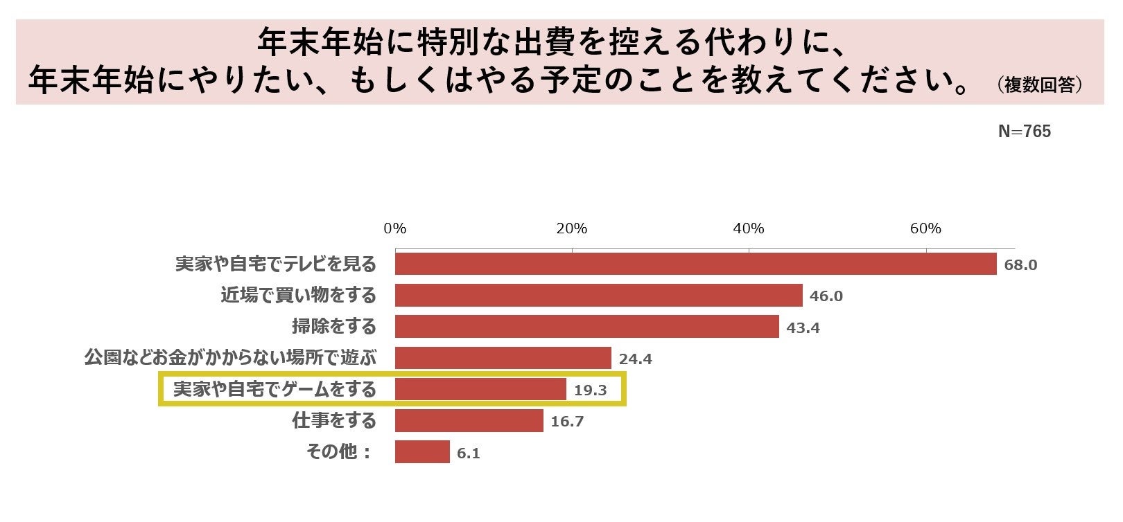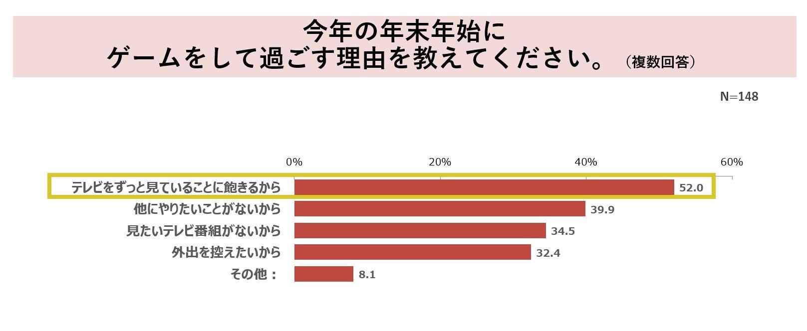 特別な出費を控える代わりに年末年始にやりたいこととして「実家や自宅でゲームをする」を選んだ人は19.3%で約2割という結果となりました。世代別で見ると、20代は32.7%、30代は29.6%と20~30代の層は約3割の人がゲームをする予定ということがわかりました。さらに、理由を聞いたところ「テレビをずっと見ていることに飽きるから」が52.0%で半数以上の人が回答。年末年始は出費を抑え自宅で過ごす時間が増える中、テレビを視聴する以外にも、家族や友人などとゲームをすることも年末年始のおうち時間充実の鍵となりそうです。