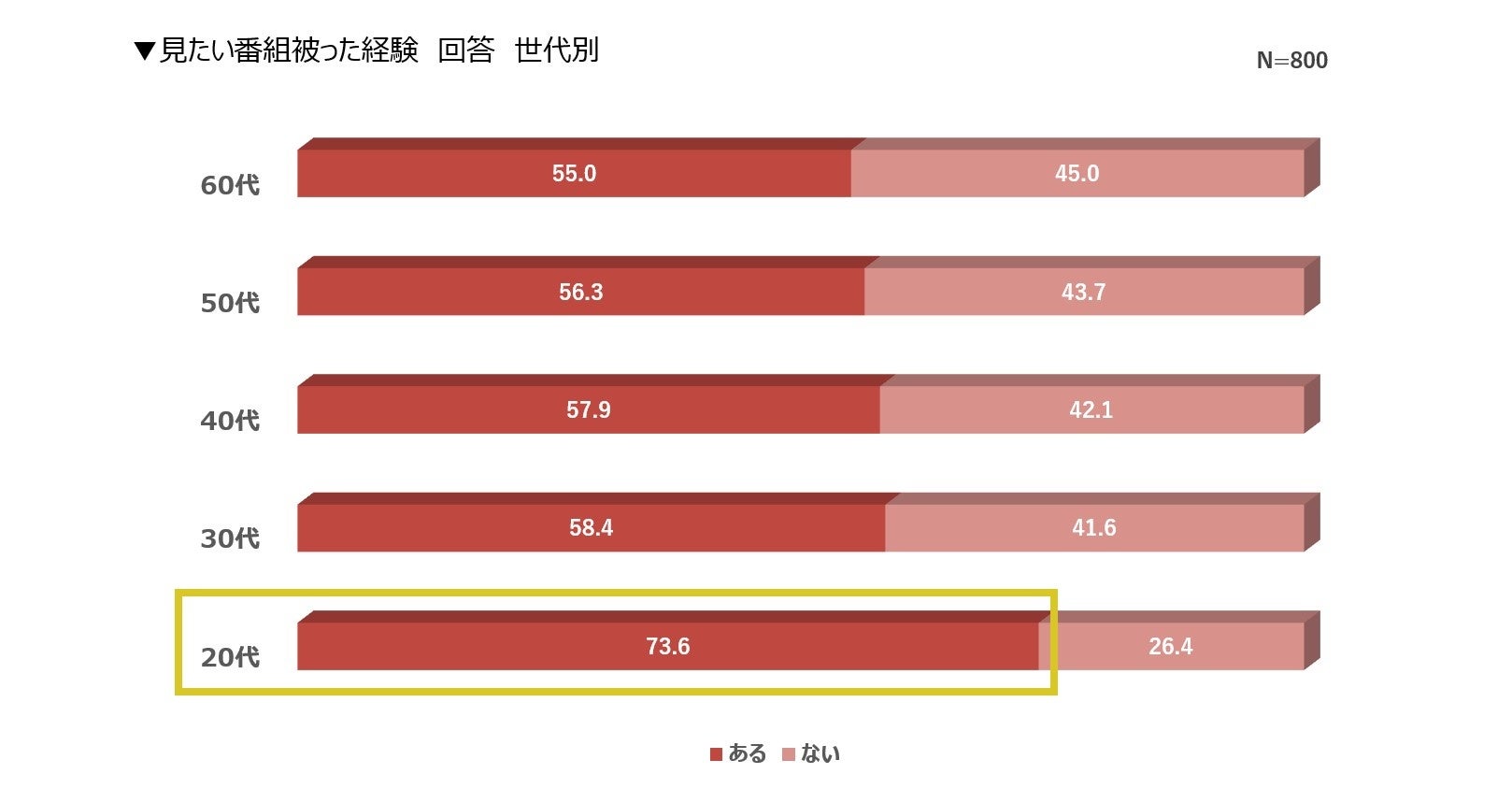 特番シーズンの年末年始のテレビ視聴において、見たい番組の放送時間が被ってしまい片方の視聴を諦めた経験があるか聞いたところ、59.0%の人が「ある」と回答。世代で見ると30代~60代は半数強に留まったものの、20代では73.6%の人が「経験がある」と回答していることから、20代は見たい番組が複数ある場面が多いことがうかがえます。