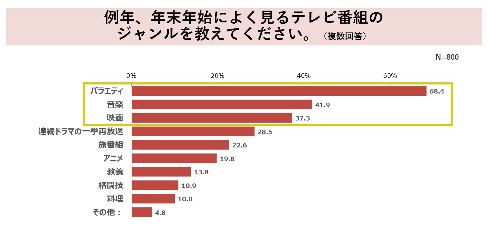 続いて、年末年始によく見るテレビ番組のジャンルを聞いたところ、1位は「バラエティ番組」で68.4%と圧倒的に多い結果になりました。次いで、「音楽番組」が41.9%、「映画」が37.3%と続きました。